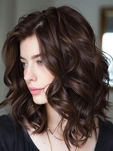 Dark Brown Wavy Lace Front Human Hair Wig – Natural Shoulder Length Glueless Wig for Women