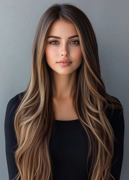 Long Straight Human Hair Wig with Highlights – Natural Brown Ombre Machine Made Wig for Women